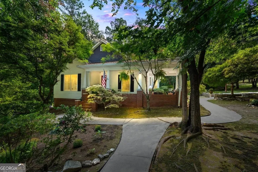 This extraordinary home is cradled within seven terraced-levels of botanical paradise that cascade over 12.64 acres of manicured grounds, walking trails, meadows, horse runs, and parklike vistas. Each window of the home frames a serene, calendar-worthy view of verdant landscape. Over 20 Japanese maples of varied species grace the property, along with tulip trees, a mulberry tree, ancient elms, a grove of tree-sized camelia bushes, abundant magnolia, and pine. In spring, plentiful Azalea bushes burst in vibrant shades of coral, white, fuscia, and red, and purple rhododendron spot the terrain. Japanese Lantern and a corridor of whimsical cherry blossoms gracefully umbrella a long walkway to both a pole barn to the north and to the south, a meadow with an alluring grassy field complete with firepit, blueberry bushes, and an enchanting, albeit uninhabitable cabin (up for extensive repair or a new build of your choice with all utilities already in place). The long winding gravel driveway finds the house hidden completely from the street affording unparalled privacy with no neighbors in sight and yet all basic needs are literally just 2 minutes away with the Atlanta International Airport, accessible in 25 minutes. An inviting brick veranda envelopes the front of this stately Arts and Crafts home and provides a shady retreat for a mindful morning java or entertaining guests. An elegant great room with soaring vaulted ceiling and stone fireplace warmly greets you as you enter home. The main level flows conveniently to include an ample primary bedroom with tray ceiling and sliding glass doors that access an L-shaped deck overlooking the yard and field beyond. Additionally, a 4-piece ensuite bath and garden tub with roomy walk-in closet, an updated elegant country kitchen with high-end appliances, an intimate dining area, and a side entrance with slate mud-room, complete the first floor. Richly colored hardwood anchors the entire main level. Other than the stairway, there is no carpet in any room in the home. The lower level offers a mirror footprint of the upstairs with a secondary bedroom, a 3-piece ensuite bathroom and large walk-in closet. A family room or flex space with a third bathroom connects to a generous third bedroom. A utility room with laundry area, and good-sized storage space finish the lower-level floorplan. Bring your horses, realize your dream hobby farm, family compound, or simply a sprawling private getaway, and revel in pastoral serenity minutes from the excitement of Atlanta and all the modern conveniences you could ever hope for.