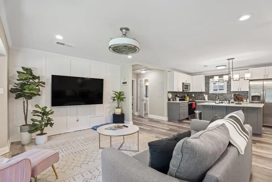 Beautiful, totally renovated with NEW ROOF, open concept home, nestled on large .34 acre lot, overlooks pretty Cofield Park with walking trails, greenspace and playground. For the jet setter or savvy investor, this home is located on the doorstep to Hartsfield- Jackson International Airport between I-75 & I-85, and bustling Downtown Hapeville, "a home for the arts" with it's own Performing Arts Center, vibrant public art, and new development happening all around. Home greets with grassy front yard, covered front porch overlooking the park, white brick, and gorgeous natural wood columns and shutters. Upon entry into great room, details such as high-end luxury Vinyl Plank Hardwood Floors throughout, new paint, new fixtures, and open concept floorplan, make the space feel so inviting. Kitchen has oversized white quartz island with overhang for barstools, white shaker cabinets, designer backsplash, stainless steel appliances, wine fridge, wall of custom pantry storage, and view of spacious dining area and family room. Family room has white woodwork accent wall and large, charming bay window. On one side of the home, separated from the other bedrooms for maximum privacy, is the Primary Suite with attached bathroom and huge walk-in closet. Primary bathroom has fabulous finishes: double sink with white quartz topped vanity, slate grey tile floors, modern fixtures, and walk in glass shower with floor to ceiling Carrera marble style tile. Guest bedrooms on the other side of the home are spacious and share an equally updated full bathroom with shower-tub combination. Off kitchen area is entertainer's wooden deck; perfect for dining al fresco, with view of flat grassy backyard oasis. Home has ample driveway parking and full laundry room. Hurry this one won't last long! *Buyer to receive $2400 credit towards closing costs or rate buydown if preferred lender, Hunter McElroy at Supreme Lending is used*