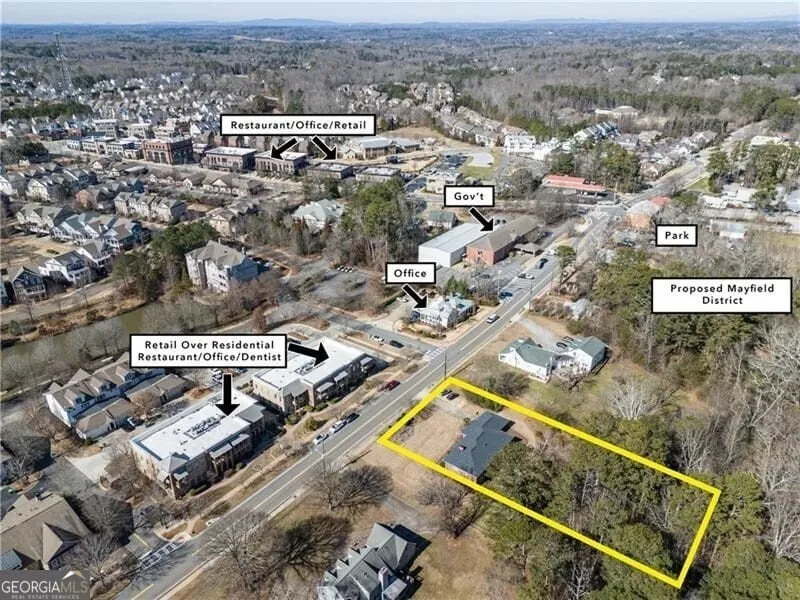 Downtown Crabapple across from existing residential/commercial and close to the proposed Mayfield District. Zoned T4 Open: mixed use, residential, commercial T4 by definition: Mixed uses including Residential, Office, and Commercial. Residential may have a wide range of building types: single, sideyard, and rowhouses. Setbacks and landscaping are variable. Streets with curbs and sidewalks define medium-sized blocks.