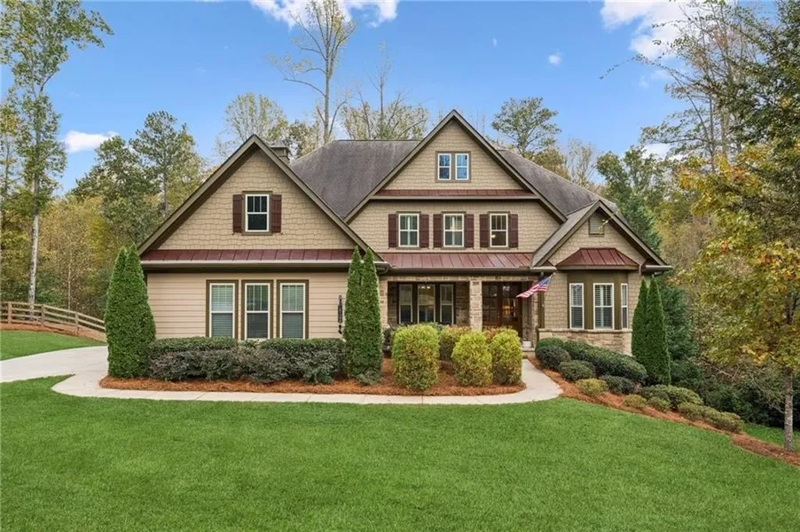 Resort living in your own home. This exceptional 6-bedroom, 6-bathroom estate sits on 1.55 private acres and features fresh paint inside and out, dual covered decks, and the convenience of both a primary suite and a guest suite on the main floor. Upon entering, you're welcomed into a spacious family room with coffered ceilings and a wood-burning stone fireplace. The space flows into the open gourmet kitchen, complete with a large island, stainless steel appliances, and an oversized hidden pantry. Adjacent to the kitchen is a bright breakfast/keeping room with access to a covered deck overlooking the private backyard. A banquet-sized dining room with elegant wainscoting provides the ideal setting for gatherings and special occasions. The main-level primary suite features separate vanities, a spacious shower, a soaking tub, and a walk-in closet with a divided space. A spiral staircase inside the closet leads to an incredible private spa and Artisan custom closet, featuring a steam shower, sauna, multi-person jacuzzi tub, heated floors, and a dedicated massage room, amenities rarely found in a private residence. The terrace level also offers a full gym, custom bar, home theater with reclining leather seating, and a spacious game/play area for everyone to enjoy, and access to another covered deck. Upstairs, a large open landing connects to four generous secondary bedrooms, including two with en-suite bathrooms, plus an additional full bath. Conveniently located off the kitchen, the oversized laundry room provides ample cabinetry alongside a functional mudroom. A 3-car garage with epoxy-sealed flooring and abundant storage completes the layout. Outside, a sprawling fenced backyard delivers privacy and space for outdoor living and future enhancements.