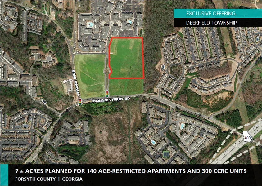 7+ acres planned for 140 age-restricted apartments and 300 continuing care retirement center (Ccrc) units in Deerfield Township in Forsyth County, GA.