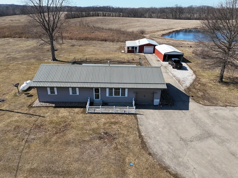 Ready to enjoy a bit of country living while still having the perks of being close to town? This well-maintained 3-bedroom, 2-bathroom home offers 1,232 square feet of comfortable living space, situated on a spacious 2-acre lot. Inside, the home features beautiful hardwood flooring throughout the kitchen and dining room, which includes a built-in corner breakfast nookperfect for casual meals or morning coffee. The cozy living room boasts a gas fireplace, a charming brick mantel, and carefully crafted wood accent walls that add character and warmth to the space. The three bedrooms are located just down the hall, with one full bath in the hallway and another as a private en-suite for one of the back bedrooms, providing privacy and comfort. The full-length basement is partially finished and houses the laundry area, offering additional living space or potential for customization. Key updates include a steel roof installed in 2018, a new furnace in 2018, a new water heater in 2023, and updated light fixtures in 2024, ensuring both reliability and style for years to come. These thoughtful updates provide peace of mind while maintaining the homes charm. Outside, the property offers plenty of space for outdoor activities, gardening, or simply family enjoyment. The fenced backyard offers privacy and security, while the attached garage and over 1,000 square feet of outbuilding space provide ample room for storage, hobbies, or additional parking. The heated outbuilding also features a screened-in three-season patio, perfect for enjoying the outdoors in comfort year-round. Additionally, a three-sided shed offers even more storage options. This home combines the convenience of modern updates with the charm of country living, offering the perfect setting for anyone looking to enjoy a little more space while still being close to all the essentials. Dont miss your chance to make this charming country retreat your own! To schedule a private showing call Land and Home Specialists Jason Endres or Marlee Schultz.