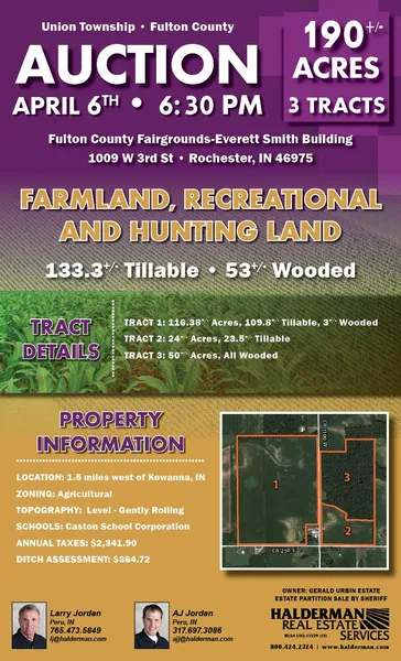 Legal Description: Located in the W 1/2 of the NW 1/4 less 6 acres in the NW 1/4 of S29, T30N, R1E; part of the E 1/2 and the E 1/2 of the W 1/2 of the NE 1/4 of S30, T30N, R1E, all in Union Township of Fulton County, State of Indiana.
