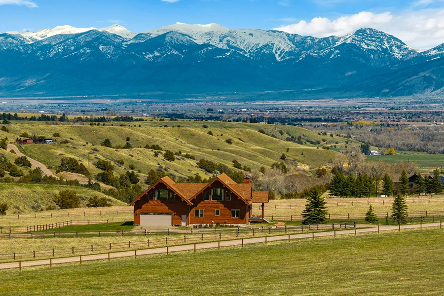 Perched on 20 scenic acres with panoramic mountain views, this rare-to-market estate offers the perfect balance of natural beauty, privacy, and functionality. Ideal for animal lovers or wide open space enthusiasts, the property is fully fenced and cross-fenced into three lush pastures with wood rail fencing, two loafing sheds, and ample room for riding or grazing. Inside, the home exudes warmth with rustic log accents, real wood flooring, and a stunning wood-burning fireplace in the open-concept living, dining, and kitchen area. The kitchen is a chef's dream with a gas range, double ovens, travertine tile, and butcher block countertops. The upper level is dedicated to a private master retreat with a gas fireplace, vaulted ceilings, and breathtaking views. The finished walkout basement offers a second kitchen, built-in sauna, full bathroom, and generous guest space—perfect for entertaining or multi-generational living. Outside, a heated, oversized shop with concrete floors and an unfinished bathroom provides excellent space for equipment, storage, or future expansion. The circular driveway adds convenience and a welcoming approach. Situated with close proximity to bustling Downtown Bozeman, Big Sky, and the Bozeman Yellowstone International Airport. With commanding 360° degree views and a picturesque setting with space to roam, this property captures the essence of the Montana lifestyle—serene, practical, and surrounded by beauty.