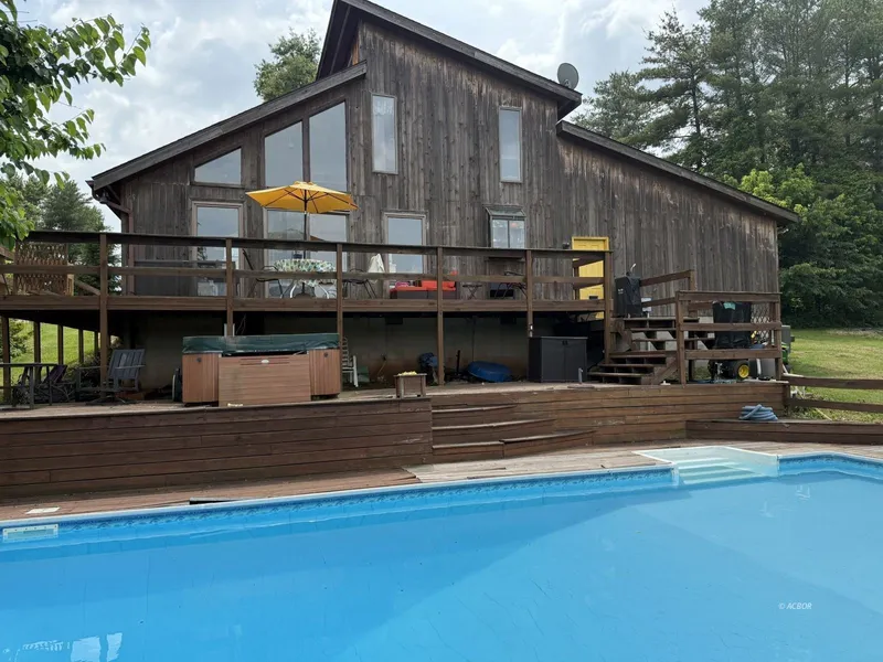 Price dropped!! Set up to view this home today! This cabin has a unique architectural design hosting a large living room, family room with woodburning fireplace, kitchen, utility, and half bath all on the main floor. The second floor host two bedrooms and a full bathroom. It has an attached 2 car garage, inground swimming pool (18x36; about 7 1/2 ft deep and about 4 ft on the shallow end) with decking around the house and for the pool. With the home comes a hot tub, washer & dryer, and kitchen appliances. The roof was new in 2023. The 40 gallon hot water tank was new approx. 2 yrs ago. The home has Anderson windows and door. All this situated on 3.46 acre m/l in such a nice country feeling location.