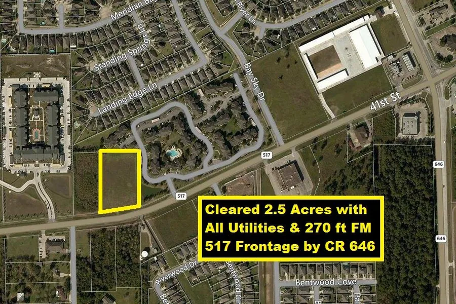 Owner Financed! Highly Visible Cleared 2.5 Acres with 270 ft of FM 517 frontage by CR 646. Surrounded by multifamily & single family homes. All Public Utilities! Great location in Dickinson near I-45 or Multifamily or single family home development. Great Investment Opportunity in Growing Area w/plenty of retail shopping nearby. Close to UHCL, UTMB, College of the Mainland & Alvin Community College. Minutes to NASA/Johnson Space Center, Nassua Bay, Texas City Refineries & Galveston Beaches.