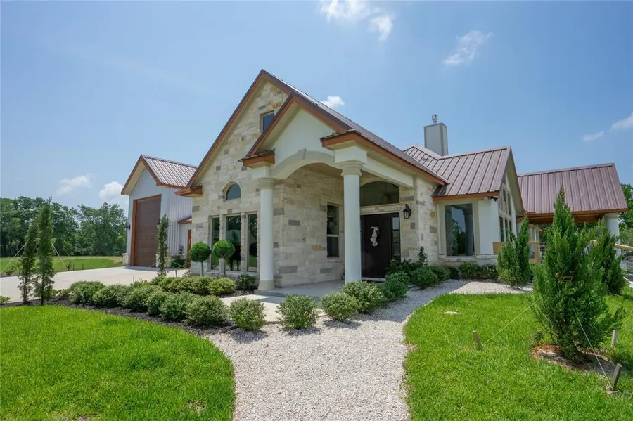 Gracious one story model home on one acre with private pond. Designed for RV friendly living, this one-of-a-kind home features two master suites, open floor plan, large covered patio, outdoor kitchen, and luxurious appointments throughout. Gourmet entertaining chef's kitchen with stainless steel appliances, including oversized six burner gas range. Separate wine bar. All three bathrooms have exquisite tile work, and granite counters. Every room has a view of the private pond. OVERSIZED garage is 2000 square feet. Has room for RV and multiple cars, boats, ATV's and work shop.