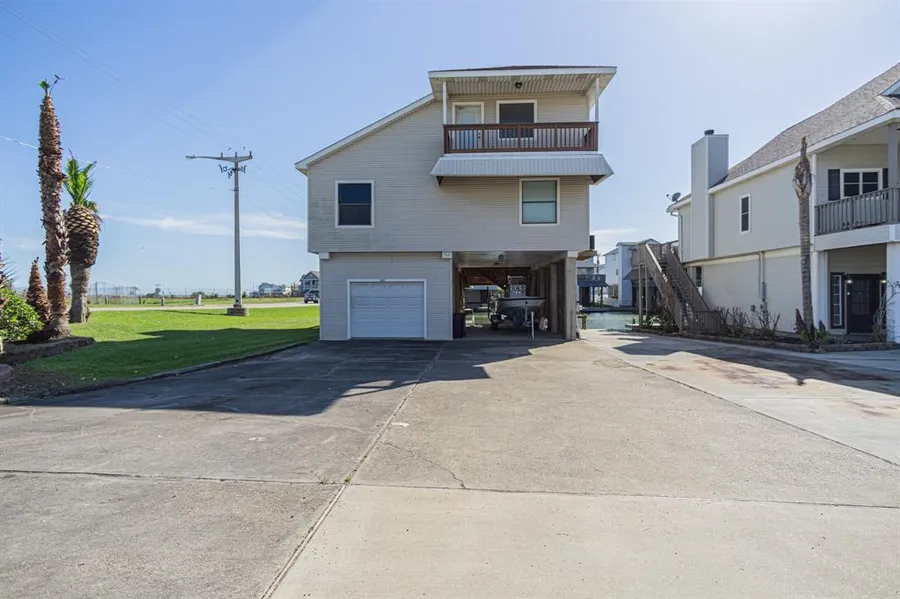 Beautiful Tiki Island home with 3 bedroom, 2 bath, boat house & lift. Primary bedroom features high ceilings, en suite bathroom with double sinks, walk-in shower & whirlpool tub. Living, dining & kitchen is all open for entertaining with wood burning fireplace. One canal off the main canal that has direct access to the intracoastal. Extended parking beside home for boat/trailer parking. Refrigerator, washer & dryer convey with the home. LOWER FLOOD INSURANCE in AE Flood Zone. Come see this today!!