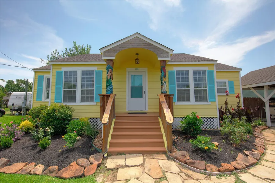 Welcome to this absolutely adorable home with Galveston Bay views. This home boasts original well-maintained 1930's wood flooring. It is situated on 3 beautifully landscaped lots (9600sf) and has a wonderful elevated Palapa patio/deck area with a matching table for fabulous outdoor entertaining. In addition, there are 2 storage buildings painted to match the home located alongside the fence. The home is updated with HardiePlank siding, replaced wiring, recent paint, crown moulding, an overabundance of double paned low-e windows and 2" faux blinds throughout! The covered carport is perfect for a car/truck or boat and there is a double wide concrete driveway and beautifully landscaped walkway leading to the front steps of the home. This home is a rare find and is move-in ready. Schedule your private showing today.