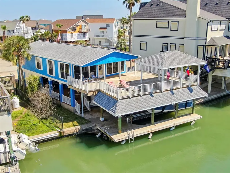IT'S ALL ABOUT THE VIEW! Unobstructed West Bay views from this immaculately maintained Tiki Island home. Features of this home include solid oak hardwood floors in the living and bedroom areas, tile floors in the kitchen, utility and bath areas, an open floor plan with lots of natural light, plantation shutters throughout, a spacious utility room with a washer, dryer, refrigerator, and plenty of storage, a large deck with an oversized gazebo to enjoy the spectacular sunsets. The downstairs is a large open area with two large storage closets, 6 ceiling fans, extensive outdoor lighting, a mosquito misting system, and tons of room for entertaining friends and family. Drop your boat in the water and be in the bay to fish in a jiffy. Spend your evenings catching fish with the 3 underwater lights and watching the boats cruise by. Paradise can be yours.