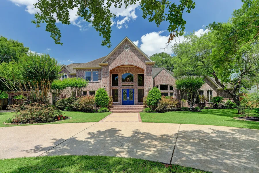 This Friendswood residence with classic design and quality craftsmanship in a prestigious location on Sunset Drive encompasses 1.19 acres. Incorporating spectacular scale with a fabulous floor plan featuring walls of glass, the home has a 100% brick exterior. The serene setting with sheltered patios looks to beautiful, old oak trees and spacious lawns. Stone flooring inside flows through generous open spaces well-suited for entertaining. The gourmet island kitchen and informal dining area open to sizable living areas. The downstairs game room with exterior access can become a second bedroom on the ground level. The primary suite enjoys a private wing of the home with enormous closets, dressing areas, a library and pool access. Four secondary bedrooms are located upstairs. The home's circular drive leads to a gated motor court with a two-car porte-cochere and 3+-car garage with front and rear entrances. Near the center of the city, the property is a part of Friendswood ISD.