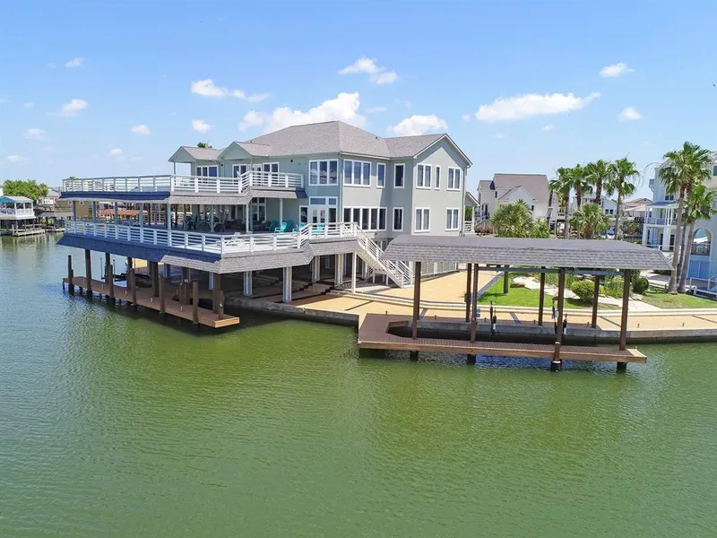 The crown jewel of Tiki Island! Situated on the point lot of Tiki lake, no expense was spared in the renovation of this amazing home. There are three boathouses, over 2400 sq ft of decking, approximately 224 linear feet of bulkhead, room for a resort-style pool, and unobstructed views of Galveston Bay. Designer finishes and decor, an elevator, a gourmet kitchen with an enormous pantry, a game room with panoramic views, and a wet bar. There are over sixty windows in this home to showcase the stunning views. This home was built for entertaining inside and out. Enjoy the bay breezes, spectacular sunsets, occasional boat parades, and fishing under the lights at night. This home has it all. Call today to schedule a private tour.
