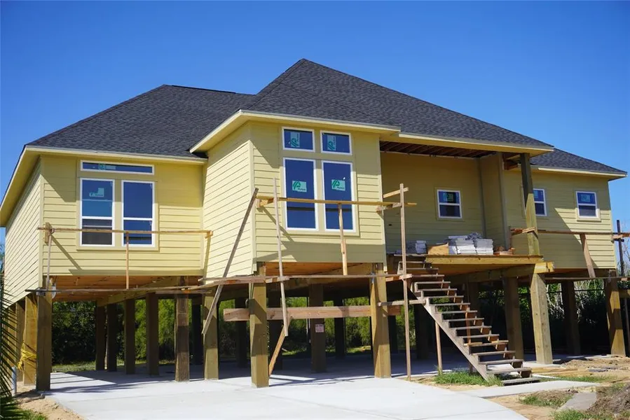 Wonderful Home Being Built by Robertson Homes in San Leon with view of the gulf from back side of home. Lumber to be #2 except bracing and plate material Tech Shield roof GAF 40 year mildew resistant shingle Hardy Siding R13 fiberglass exterior wall insulation R38 fiberglass ceiling insulation vinyl windows with insulated Low E glass 16 seer energy-efficient air conditioners, 200 amp electrical service one 50 gallon hot water heater Wirehouse for ( CAT 5 ) Prewire for security Gutters Crown molding in kitchen, great room, dining rm, foyer, and master bedroom 4 " baseboards 3 " casing GREATROOM Hardwood flooring Wood ceiling beams KITCHEN Custom wood cabinets with granite tops Under-mount stainless sink Tile floors DINING Hardwood flooring MASTER BEDROOM Bedroom has hardwood flooring Tile in bath Granite with under-mount bowls Tile shower Satin nickel shower door