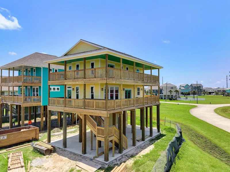 Enjoy an estuary and wetlands facing out toward the bay, nestled by surrounding Green Space, excellent for birdwatching just lounging right off your wrap around, double level, 1500 sq. ft. of deck. A huge bonus is the cabin is only 4 mi. from the West End Marina, you can dine, swim, boat, listen to live music there. The home has high ceilings, impact resistant doors and windows, LED recessed lighting, trimmed doors, windows, and baseboards. The kitchen boasts a walk in pantry, quartz counters, and solid, modern, white shaker cabinets. Primary bedroom has an en suite bathroom, double sinks, separate water closet, and walk in closet. The floor level can cover an RV, double driveway, outside shower, and small enclosed space for storage or parking. Great place to make your home or your second home; you'll find yourself enjoying and relaxing in the lifestyle. Neighborhood beach access through two tunnels that run beneath San Luis Pass Rd. and he subdivision also has a community pool.