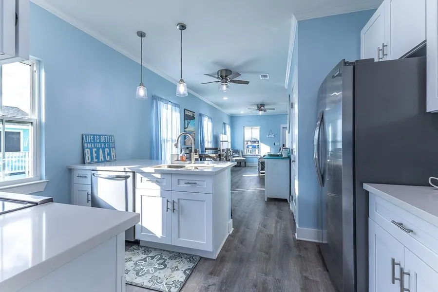 Enjoy on the west end of Galveston Island in Palm Beach, next to Pirates Beach. This like-new 2021 build has all of the custom finishes you want and is strategically located minutes from shops, restaurants, the Galveston Country club, and Waterman\'s Marina. With spacious covered and uncovered composite decks on both the front and back of the home, you\'ll enjoy gorgeous views of the sunrise and sunsets. Ground level is well lit & garage is plumbed and wired, ready for you to add a summer kitchen. Home has been a successful part-time short term rental. The kitchen features quartz countertops, tile backsplash, soft close cabinets, stainless steel appliances, and generous pantry. One of the secondary bedrooms has built-in bunk beds with clothing storage at the bottom, and the second is a great size for a queen set. The primary and secondary bedroom closets have built-in shelving and storage organization. Laundry is located in the hallway between the secondary bedrooms.
