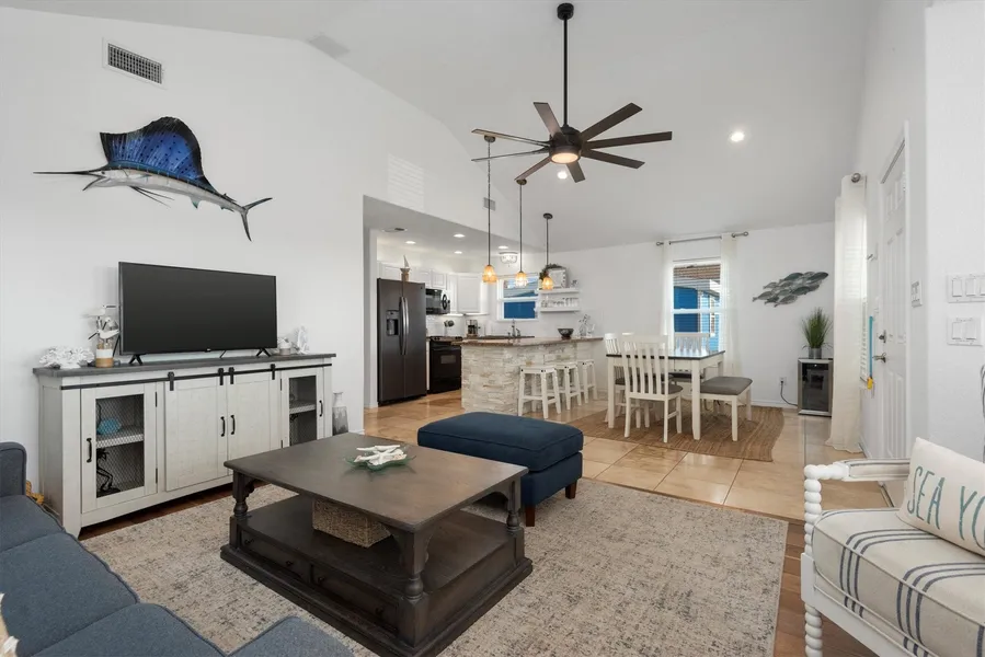 Remodeled, fully furnished beach house in Sea Isle, Galveston. This beautiful 3 bedroom home (comfortably sleeps 8) has a fantastic covered porch and open concept living area with tastefully designed beach-themed decor that perfectly complements the coastal surroundings. Downstairs you will find a spacious garage with a built in bar, convenient kitchenette, half bath + outdoor shower and entertainment space with TV and speakers that is perfect for grilling and enjoying the coastal breeze. The beach is just a 5 minute walk or 2 minute golf cart ride away. Updates include: electric storm shutters on all windows, new privacy fencing and sprinklers, AC/Heat, water heater, new dishwasher, and more. Sea Isle offers an amazing marina with restaurant, bar, shop, pool, tennis, park. Don't miss out on this opportunity to own your own slice of paradise -make this your weekend getaway and/or vacatio...