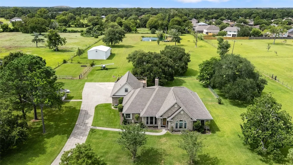 Nestled on almost 5 acres, this stunning Santa Fe ranch-style home offers space, comfort, and versatility. With 4 bedrooms, 3.5 baths, and a dedicated office, this home is as functional as it is beautiful. Outside, you ll find a 30' x 40' steel workshop with two vehicle bays and a separate walk-in door. There's also a private, stocked catfish pond with a dock perfect for relaxing afternoons. The large covered patio is ideal for entertaining, and a staircase leads to an oversized upstairs bedroom with full bath great as a guest suite or rental. Inside, enjoy granite countertops, built-in storage, a spacious laundry room, and more. The primary suite offers a walk-in closet, luxurious en-suite bath with soaking tub, and a bright sunroom retreat. The kitchen features a large island, double ovens, ample counter space, and a built-in desk for homework or home management. This property is a must-see!