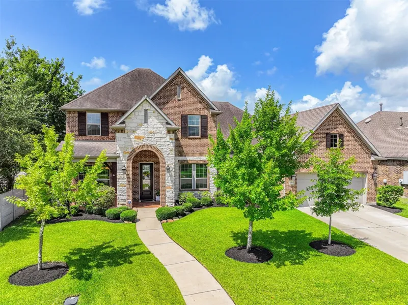 Discover this stunning brick and stone 2-story home located in Arbor Gate, the only gated section of prestigious West Ranch. Offering 5 spacious bedrooms, 4 full baths, a private study, and an upstairs retreat, this home is designed for both comfort and functionality. The open-concept layout features a large living area with a fireplace and flows seamlessly into a beautiful outdoor living space, ideal for entertaining. The first-floor primary suite is a luxurious retreat with a spa-like bath, including a soaking tub, dual vanities, a walk-in shower with custom tile accents, and a generous walk-in closet. A second bedroom and full bath are also conveniently located on the main level. Additional highlights include a 3-car garage, energy-efficient EFL Diamond certification, and elegant finishes throughout. This exceptional home offers space, style, and privacy in one of the area’s most sought-after communities. Grab this gem now this won't be in the market long!