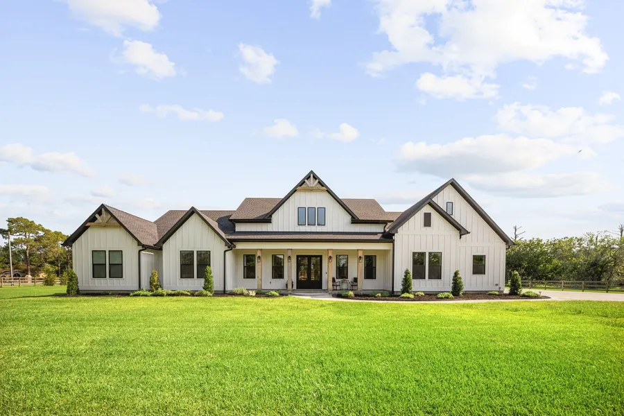 Custom luxury meets thoughtful functionality in this stunning 5-bedroom, 4-bath home on 1.06 acres in highly sought after Friendswood ISD. The gourmet kitchen shines with an expansive island, porcelain counters, pot filler, custom cabinetry, and a walk-in pantry. Designer lighting and sleek fireplace brings elevated comfort to the open living and dining room areas. Retreat to the serene primary suite with a spa-style bathroom featuring an oversized wet room, double vanities, and custom walk-in closets. A hidden safe room adds peace of mind and a private guest suite with full kitchen adjoins the main home offering the perfect set up for guests or multi-generational living. Outside, enjoy a covered patio, lush landscaping, and a spacious yard with plenty of room for a pool. Additional highlights include a 3-car garage, automatic gated entry, oversized laundry with sink, and a dedicated home office. A rare opportunity blending elegance, comfort, and flexibility in a prime location.