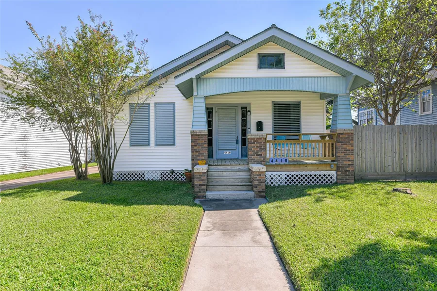 Charming and spacious 2 bedroom 1 bath craftsman style home with a bonus efficiency garage apartment. This home sits on a full sized lot on a quiet street in mid town Galveston. The interior features original hardwood floors, tall ceilings, and exposed ship lap for added charm. Spacious open concept living dining area with plenty of room for a full sectional and dining set. The kitchen features natural look tile with granite counter tops and a single basin farmhouse sink. Rear bedroom has an extra room that could be a home office or easily converted to an en suite bathroom. Nice backyard with privacy fence and raised wooden deck. Bonus efficiency garage apartment features tile flooring, a kitchenette, and full bathroom. Two car garage with automatic garage door openers and access to the alley. Great central location next to Cedar Lawn and easy access to Broadway or the Seawall.
