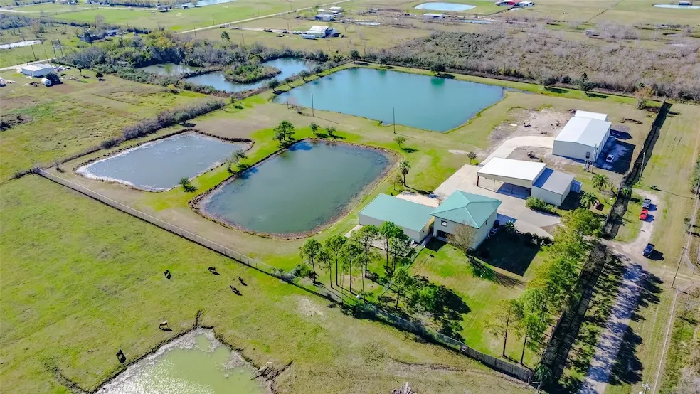Nestled on 10 fully fenced acres near coastal San Leon just minutes from boat ramps, prime fishing, the Kemah Boardwalk, and Galveston this one-of-a-kind estate seamlessly blends residential comfort with commercial potential. The 4,000 sq. ft. barndominium residence features two bedrooms, 3.5 baths, and a spacious second floor primary suite with dual ensuites. The main level boasts an expansive living area and a well-appointed kitchen. Additional highlights include an elevator, storm shutters, and a port-a-coch re.Outside, enjoy three stocked lakes, a 5,000 sq. ft. climate-controlled warehouse, a 1,150 sq. ft. auxiliary building, and a 4-car garage with an oversized attached carport. The 2,580 sq. ft. pool house offers a heated pool, spa, full bath, and open patio area. With an irrigation system, adjacent acreage available, and nearly unlimited potential, this exceptional haven delivers unparalleled comfort, versatility, and the ultimate in coastal living.