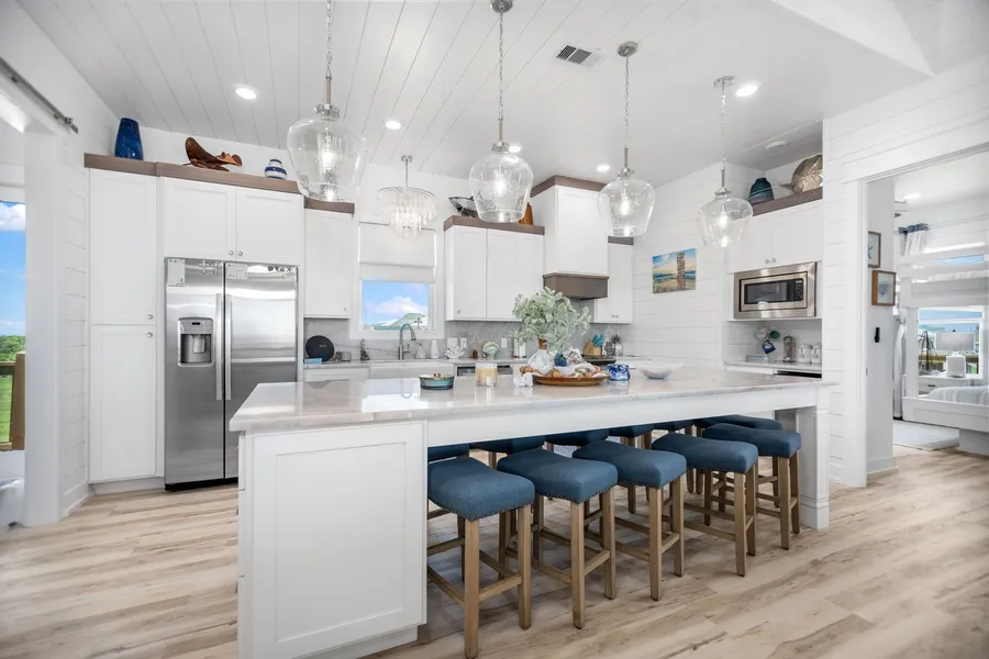 BEACH FRONT Paradise! Don’t miss this stunning, fully furnished custom-built home on 2 large lots with full dune restoration. This private oasis offers 4 bedrooms & 4 bathrooms upstairs, plus 2 bedrooms & 1 full bath downstairs—sleeping 24! Enjoy tall ceilings, huge windows with beach views, a spacious kitchen with large island, quartzite countertops, custom cabinetry, stainless appliances & built-in ice maker. No corners cut! The owner’s suite features gorgeous views, a soaker tub & walk-in shower. A 2nd primary suite also offers stunning views. Cozy up by two fireplaces—one in the living area, one in the primary bedroom. Built-in bunks, tankless water heater, spray foam insulation & efficient HVAC with dehumidifier included. Enjoy breathtaking Gulf views from the HUGE deck with hot tub, or watch sunsets from the back deck. Ample storage & garage space downstairs. Comes fully furnished ...