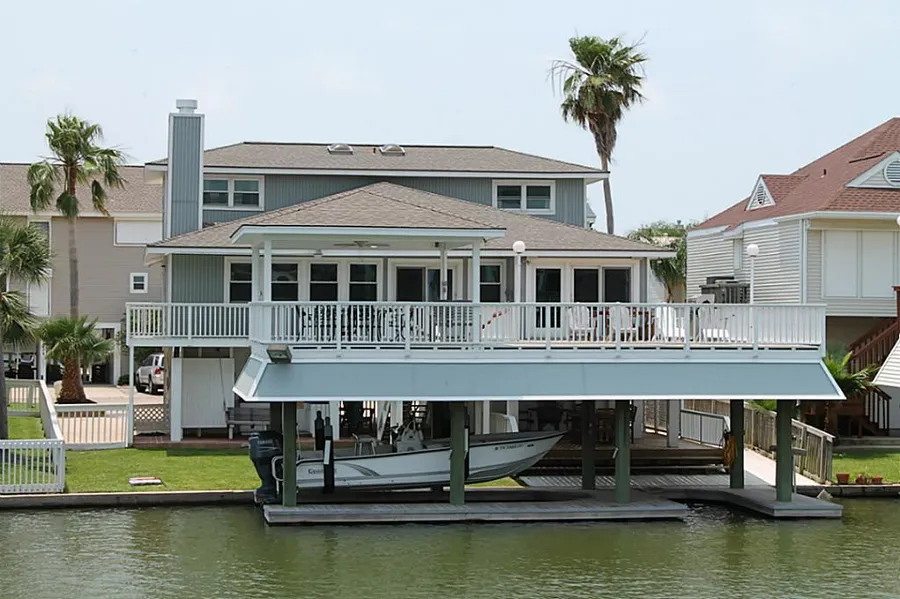 Coastal home on wide canal w/excellent bay views. Spacious living w/many windows (impact)/built-ins/WB fireplace. Bright galley-style kitchen w/lots of cabinet storage. Wood flooring. Master suite on 1st floor. Master bath w/double sinks, separate shower & tub. 2 bedrooms upstairs both w/full baths. Large deck main level & gazebo over boat house. Tiled patio area w/outdoor wet bar. Boathouse w/lift & extra slip. 4th bedroom on ground level w/full bath. New roof 2007.