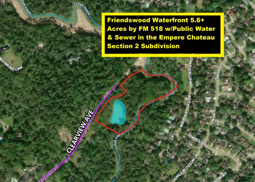 Friendswood waterfront 5.6+ acres by FM 518 w/public water & sewer. Property is 2 tracts: Lot 30 is 1.1238 acres & the remaining 4.8209 acres was to be a park for the Empere Chateau Section 2 Subdivision. Home can only be built on Lot 30; no home can be built on the park tract. Clear Creek wraps around E. & S. borders. Clearview Ave runs along the N. border. The City owns the open space of land on the W. side. The property lies in the City of Friendswood and is zoned as Single Family Residential. It is located 0.5 miles E. of FM 518/downtown Friendswood; 4.5 miles W. of I-45 & 10.5 miles West of NASA; 21 miles south of downtown Houston; 28.5 miles N. of Galveston Island. It has ~728 ft Clearview Ave Frontage & ~1249 ft Clear Creek Frontage (see plats). Several good hardwood trees on the site and once cleared, it should be quite beautiful. Property is located in the Floodway & is priced accordingly. Please consult an engineer regarding building requirements before making an offer.
