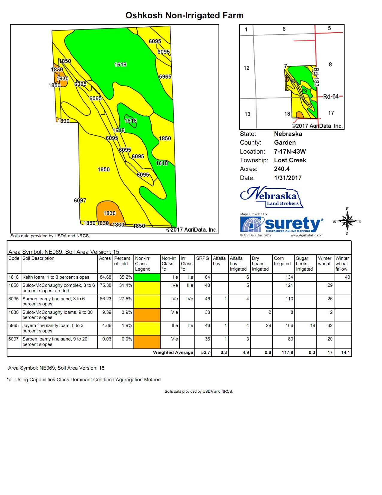 LAND USE: 223.95 acres of non-irrigated cropland that consists of 35% Class II Keith silt loams and 58.9% Class IV Sulco-McConaughy and Sarben silt loams.15.57 acres of CRP is in 3 contacts paying a total of $622 annually.