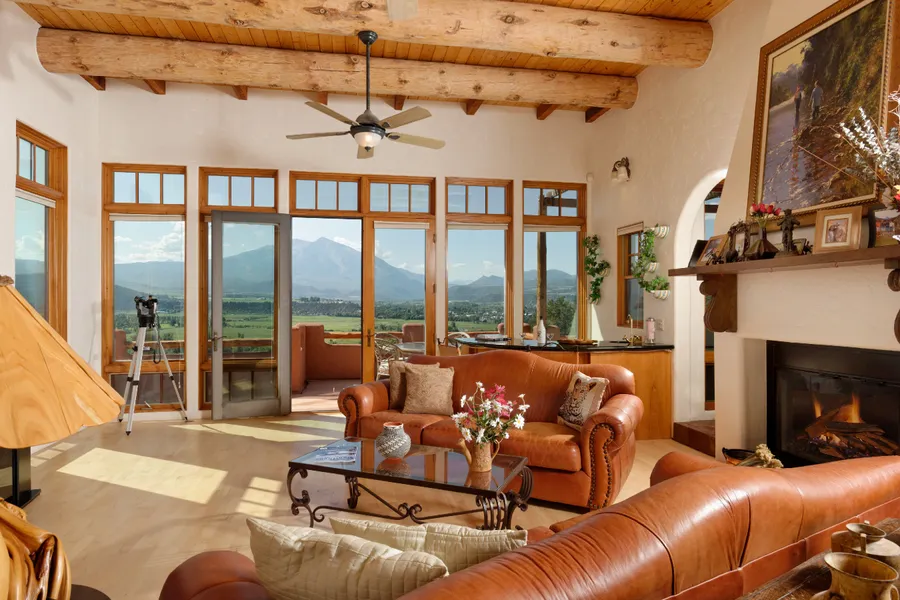 Front-row views of Mount Sopris and the Roaring Fork River Valley fill the windows of this beautiful home. 16'' logs and 14' foot ceilings make this home feel grand but comfortable. Southern exposure ensures plenty of natural light in every room. Additional features include 2,200 square feet of decks and patios for indoor/outdoor living and entertaining, elevator, high-speed internet service, 2+ car garage, snow-melted driveway, wet bar, two laundry rooms, caretaker unit / guest quarters with separate entrance and kitchenette, and pool table. All this on a secluded 2+ acre lot, conveniently located only five minutes to Carbondale.