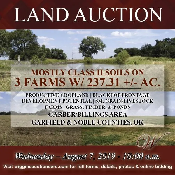 3 Farms | 237.31 +/- Acres w/ Productive Cropland & Blacktop Frontage Development Potential | Sm. Grain/Livestock Farms | Grass, Timber, & Ponds Garber/Billings Area, Garfield & Noble Counties, OK