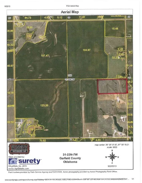 2800 N. Imo Road * Prime developmental land * 2 mi. W. of Garland Rd. on Willow Rd. then 1/4 mi. N. OR 2 1/4 mi. N. of Hwy 412 on Imo Rd. OR 2 3/4 mi S. of SH 45 on Imo Rd. * w/in minutes of Enid * Enid School District * tracts will be offered separately, then together 2012 Taxes: were approx. $77.00. The 2013 taxes will be prorated to the day of closing. Legal Description: Tract #100 in SE/4 Sect 31-T23N-R7WIM (Tr #8 Willow Springs) & Tract #130 in SE/4 Sect 31-T23N-R7WIM (Tr #7 Willow Springs). Minerals: Do not sell. Possession: is to be given upon payment in full of the purchase price and transfer of title, at closing. Terms: 10% of the purchase price is to be placed in escrow the day of the auction with the balance being due upon delivery of merchantable title. All information is taken from sources believed to be reliable; however, no guarantee is made by the auction company or its employer. Buyers should satisfy themselves as to acreage, crop base, etc. prior to auction day. Any announcements made the day of the auction supersede all advertising. Contact Kim Allen, Real Estate Co-Broker/ Auction Manager, at 541-3180 or 233-3066 for any additional information you may need.