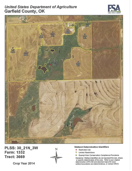 Farm #1 (160 +/- Acres): This is an outstanding sm. grain/livestock quarter. It is located 1 mile east of Covington, OK on S.H. 164, then 1 1/4 miles south on good county roads. According to the Garfield County F.S.A. this farm is in an F.S.A. unit which has 167.27 acres of cropland with a 167.3 acre wheat base and a 36 bushel per acre yield. There appears to be approx. 105.93 acres of cropland on this NW/4. Principle soil types of the cropland are Kirkland silt loams, Class II & III; and Renthin-Masham complex, Class III. This land lays level and is easily tilled. The balance of the land is in grass pasture, scattered trees, 3 nice size stocked ponds, & streams. Improvements include perimeter & pasture fence. Be sure to take a look! 12 Taxes: were approx. $375.00. Legal Description: NW/4 of 30-21-3 W.I.M., Garfield Co., OK.