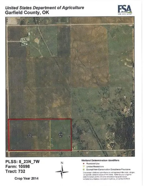Farm #1 (80 +/- Acres): This land is located from Jct. SH 132 & SH 45 (1 mile south of Carrier) 2 miles east on SH 45, then 1 mile north OR 3 miles west of Chisholm School on SH 45, then 1 mile north. This is an outstanding opportunity to purchase 80 +/- acres of land within minutes of Enid & in an area with an abundant amount of water & several irrigated quarters across the road & nearby; in addition to recent housing development in the area. This land offers the perfect combination of highly productive cropland, good grass pasture/hay meadow & a pond. According to the Garfield Co. F.S.A. there are 50.85 acres of cropland with a 50.9 acre wheat base and a 40 bushel per acre yield. The principle soil type of the cropland is mostly Pond Creek silt loam, Class I with a sm. amount of Carwile loam, Class IV along the east edge of the crop field. Improvements include a water well & perimeter & cross fence. Be sure to take a look! 13 Taxes: were approx. $286.00 Legal Description: S/2 SW/4 of Sec. 8, Twp. 23 N., R7 W.I.M., Garfield Co., OK