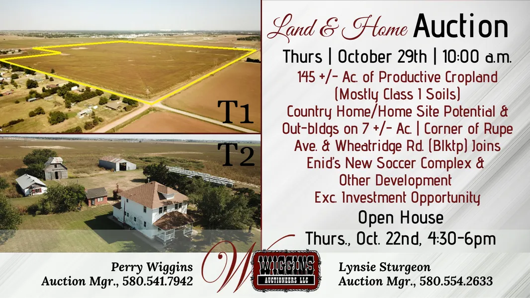 145 +/- Ac. of Productive Cropland (Mostly Class I Soils) | Country Home/Home Site Potential & Out-bldgs on 7 +/- Ac. | Corner of Rupe Ave. & Wheatridge Rd. (Blktp) Joins Enids New Soccer Complex & Other Development | Exc. Investment Opportunity
