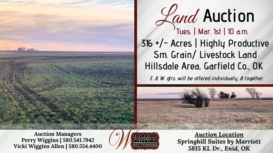 Order of Auction: E. & W. qtrs. will be offered individually, & together. 21 Taxes for Entirety: were approx. $1,484.00. The 22 taxes will be prorated to the day of closing. Legal Description: S/2 of Sec. 4, Twp. 24N, R7 W.I.M., LESS 3.76 +/- acres in the SE/4 Possession: of the cropland is to be given at closing, subject to existing ag lease which expires upon completion of harvest of the 2021-2022 wheat crop or July 1, 2022, whichever is later; Possession of the grassland: at closing, subject to the existing ag lease which expires on or by Aug. 1, 2022. Minerals: Do not sell. Registration: All bidders are required to register with valid form of ID and acknowledge and agree to auction terms & conditions. Absentee bidders who wish to authorize another person to bid/purchase on their behalf, please provide a letter of authorization. Contact the Auction Company for details. Terms: 10% of the purchase price is to be placed in escrow day of auction with the balance being due upon delivery of merchantable title. All information is taken from sources believed to be reliable; however, no guarantee is made by the auction company or its employer. Buyers should satisfy themselves as to acreage, crop base, condition, etc. prior to auction day. Announcements made day of auction take precedence.
