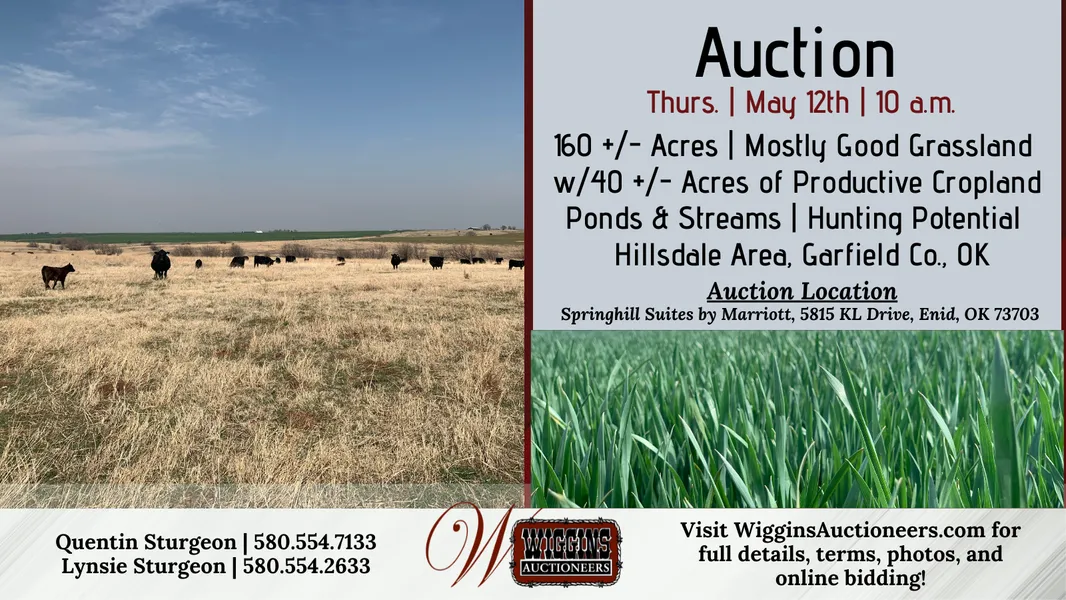Taxes: The 2021 taxes were approx. $300. The 2022 taxes will be prorated to the day of closing. Legal Description: SW/4 of Sec. 3, Twp. 24N., R8W Minerals: Do not sell. Possession: Grassland: at closing, subject to the existing ag lease which expires Aug. 15, 2022. Cropland: at closing, subject to the existing ag lease which expires upon completion of the presently growing crop or July 1, 2022, whichever is later. Registration: All bidders are required to register with a valid form of ID and acknowledge and agree to auction terms & conditions. Absentee bidders who wish to authorize another person to bid/purchase on their behalf, please provide a letter of authorization. Contact the Auction Company for details. Terms: 10% of the purchase price is to be placed in escrow day of auction with the balance being due upon delivery of merchantable title. All information is taken from sources believed to be reliable; however, no guarantee is made by the auction company or its employer. Buyers should satisfy themselves as to acreage, crop base, condition, etc. prior to auction day. Announcements made day of auction take precedence.