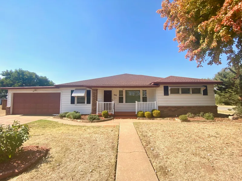 402 Nebraska, Drummond, OK is an expansive home with a 4 bedrooms, 3 full bath home and 2 attached garages. One garage has a safe room and still room to park a car. The other is oversized! The covered front porch is great and entry is into the living area adjacent to the formal dining. Two bedrooms share a hall bath while the 4th bedroom could easily be a 2nd living area. A primary bedroom is enormous and has a private bathroom and extra large closet. The 3rd bathroom is off the giant utility room. Storage is galore in this home. Want a big kitchen? Check this one out and there is a dining space. Outside is a covered patio and wood fenced yard. 4 lots and on the corner!