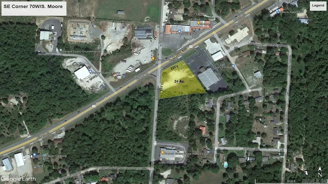 2 acres at prime commercial corner with 200+ frontage on busy Hwy 70W (21,000+/- cpd) at stoplight intersection. Level lot with access on two sides in an area of commercial growth. All city Hot Springs utilities available, additional 3+/- adjacent acres available. Billboard lease does not convey.
