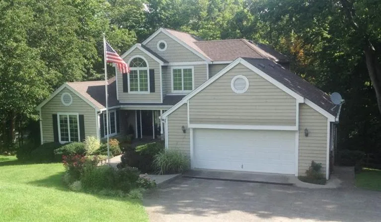 Renowned architect designed lakefront home on double lot in no wake zone with 344' shoreline, metal steps & dock. Located in upscale lake & golf course community. Amenities include: lg great room boasting cedar wood cathedral ceilings, wood burning fireplace w/stone surround, wet bar, skylights & hardwood floors. Updated eat in kitchen w/oversized cabinets, granite counters, island/bar w/surface cooktop, built in wall oven & stainless professional grade counter depth fridge. Office. Main level master suite w/walkout to the back deck & updated master bath. Granite counter, double sinks, walk in closet, lg jet tub & separate tiled shower w/frameless glass enclosure. Upstairs level has 2 bedrooms, bath & lg loft overlooking great room. Walkout basement great for guests or in law suite. Kitchenette, bath, gas propane free standing fireplace, rec room w/pool table, 4th bedroom (no window) and family room w/built in entertainment center. A second 25'x 35' detached garage. Screened in porc