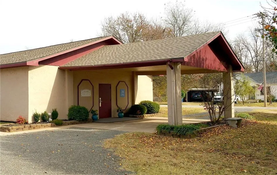Nice building currently used for a church with gravel parking lot and 1 outdoor storage building. Inside is a nice size auditorium, separate men's and women's restrooms, library, and storage closets. Property sits across the street from Shady Grove Park. Many possibilities! Check with city on zoning.