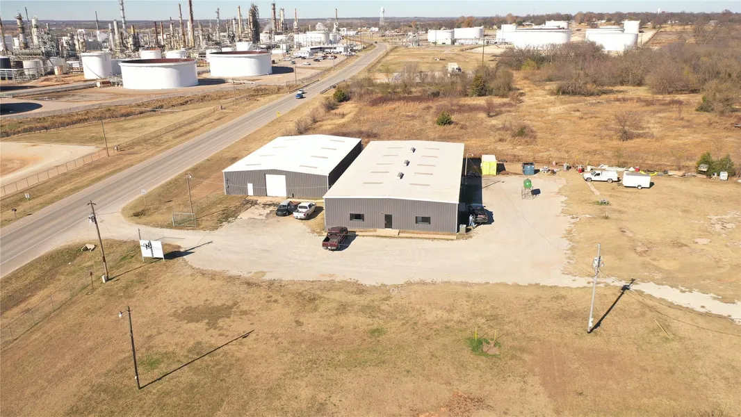 Great Location with Hwy 77 frontage. Property has 2 huge buildings. One is 6500 Sq ft with 2 over head doors the other is 7500 Sq ft with office area in front and shop area in back. Office has 5 rooms with a waiting area and bathroom. Lots of possibilities.! Property is located across the street from the Refinery. 3 phase electric is not far. The property also has another septic, electric pole and water meter where an old house was.