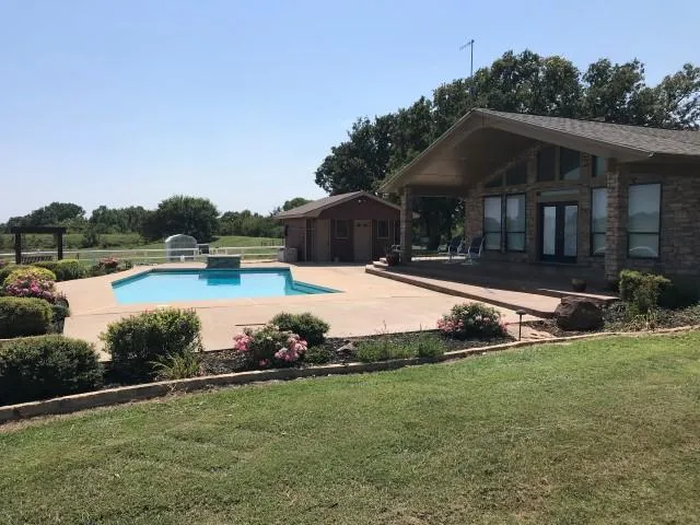 26155 Highway 29A Stunning property on 80 ac mol sits a 3460 sq ft home (MOL) From entry to exit the home is full of beauty and ready to have a new owner. Call Renee 580-706-0151 to set up an appointment to see the freshly painted white piping fence surrounds part of the home and south west side of property. Built in 1973 the once brick home has had a total make over ongoing to get the completed look. Stucco siding over the bricked home was added a few years ago to give it a touch of modern look. Cooper color down spouts and flower gardens surround the front rock laid porch. The owners bedroom includes a walk in shower with double sinks and is just off of the kitchen and laundry area. No hall to speak of, the two bedrooms are divided by a tub sink combination bathroom. A+ quality of wood custom built cabinets and counters of granite. The breakfast bar can hold several chairs on two sides. A formal living room or office located just inside the office. Step into the Florida room and feel like you are outdoors with the oversized windows letting the light shine in. This room with a faux fireplace has room for seating a crowd as well as a second dinning area for big events or just space to breath. From the back porch you can see the approximately five acre water shed pond (depth estimated at 10ft but never actual measured.) Jump into the pool and when you are ready to change clothes or shower use the pool house for a fun day in the sun. With the pool house also has bathroom facilities. North end of the property is a 60 x 80ft shop with a 20ft overhang with water and electric plenty of room to use for big or small projects. The pole barn apx 40 x 60ft room for a big tractor or equipment. The storage building sits just to the north of the home. There is a second road to the property that leads to the shop they once ran a business from that location.