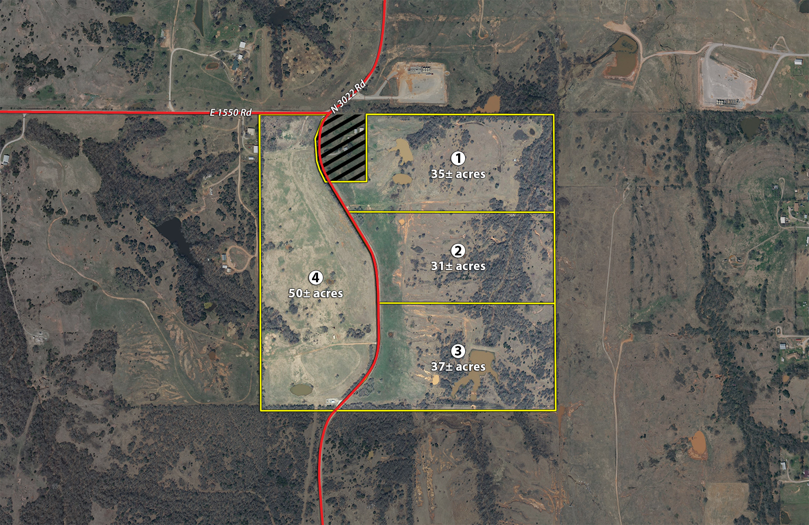 The Garvin County 153 is an exceptionally diverse real estate holding, located just minutes from the convenience of Lindsay, OK. The property blends agricultural, homesite and recreational value into a single property like parcels of this size seldom do. The western 50+/- acres of the property is comprised of an excellent Bermuda Grass pasture spotted with scattered Oak Trees. While the eastern side of the property is an excellent mixture of native grass pasture, heavily wooded creek bottom and numerous ponds. The creek flows from north to south throughout the property and offers a number of potential areas for large water features. An immediate value add can be found along the south boundary of the property, with a once 2+/- acre watershed pond in need of some dam repair to add instantaneous value to the property. In addition to these attractive features, the property has outstanding access with County Road 3022 running north to south through the center of the property! Bidders will have the opportunity to submit bids on any individual parcel or combination of tracts that best fit their needs!