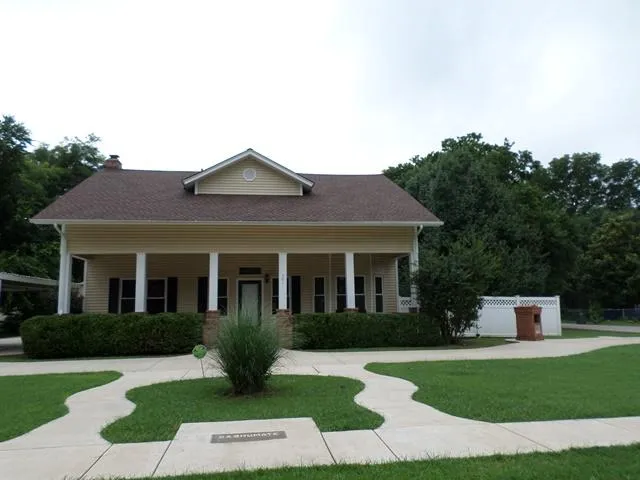 Circle drive in front of house. Built-in mailbox.