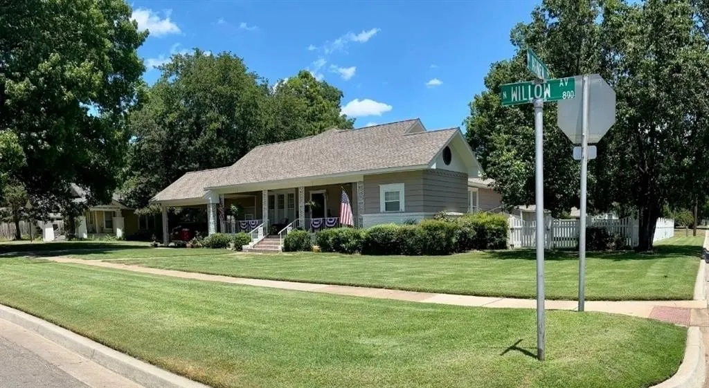Nestled on a picturesque, tree-lined street in the heart of downtown, this unique property sits on a desirable corner lot and offers incredible value. The main home welcomes you with an expansive covered front porch—perfect for relaxing and enjoying the neighborhood charm. Inside, the bright living room features beautiful original hardwood flooring, large windows with elegant plantation shutters throughout, and plush carpet in the bedrooms for added comfort. The spacious dining room sets the scene for memorable family gatherings. The kitchen offers ample cabinetry and comes fully equipped with all appliances. Just off the kitchen is a separate utility room and the back door that leads out to a charming wood deck, enclosed within a pristine white vinyl fence. The main home features include two bedrooms, 2 full baths, crown molding throughout, a large bonus room that could be used as another bedroom or office, and a recently updated central heating and air system. Two utility buildings are also included for extra storage. The home also has a full sprinkler system, new pergola off the back deck and a new freestanding carport.