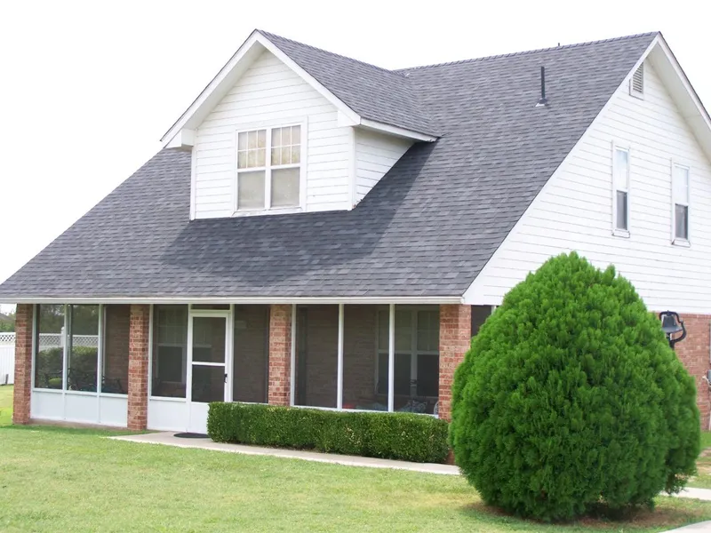 Near Town, 10 min. to I-35, Appealing 3 bdrm. 2 bath, downstairs mstr. bath has walk-in tub w/hand held shower, screened front porch, upstairs has small sitting area for TV or office plus oversized closet for strg., dozens of trees in font yard, white vinyl fencing, cellar & strg. building paved circle drive, Great home for anyone wanting peace & tranquility!! AND NEW ROOF PUT ON IN JULY 2018!