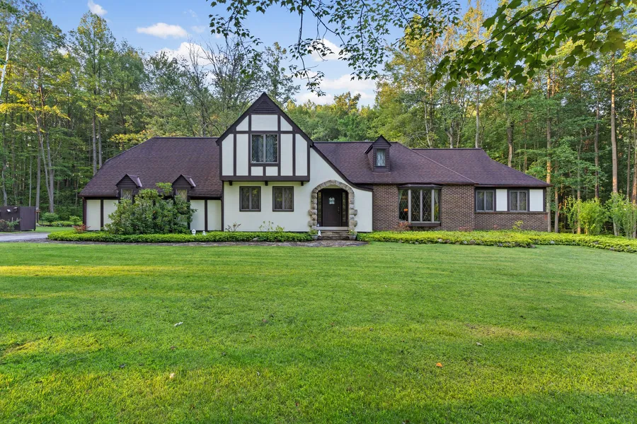 From the moment you see this English Tudor home you will be in awe. Situated on over two acres of pure serenity you will feel like you are on vacation. Enter into the two-storied foyer with curving stairway and become entranced by spectacular views in all directions. A chef’s dream kitchen with an abundance of cabinetry, countertop space, with all appliances included connects to a skylighted, walls of windows, sunroom overlooking a backyard sanctuary brimming with nature’s bounty. Sip your morning coffee while relaxing to the sound of birdsong accompanied by the waterfall in your private pond as a doe with her fawn gets a drink. Grand family room boasting in size with stone floor to ceiling wood burning fireplace. Retreat to your first floor master suite and relax in the jetted tub as you view the stars through the skylight in the vaulted ceiling. The second level has three spacious bedr...