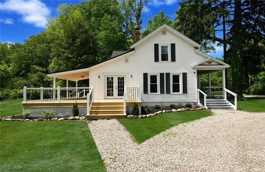 STUNNING! Gorgeous, fully renovated Gable Front + Wing Farmhouse on a fabulous 1.5 acre lot w/ private pond, a huge Barn style 2 car garage w/ metal siding/metal roof+additional storage, horseshoe driveway+ a marvelous newly built wrap around deck with awning! Everything to do with this home has been fully updated/renovated! The main level offers a charming living room with woodburning fireplace, a dining room or multipurpose room/possible office w/ beamed ceiling, 1st floor primary bedroom w/ private 1/2 bath + a gorgeous expanded/fully renovated kitchen w/ walk in pantry closet! The 2nd level offers two nice sized bedrooms with fully refinished hardwood floors, a newly constructed 2nd floor laundry room, + a fabulously remodeled full bathroom w/ stylish sliding barn door! Updates include: 12k Basement waterproofing August 2024, laminate in living room, dining room, stairs + Upper level...