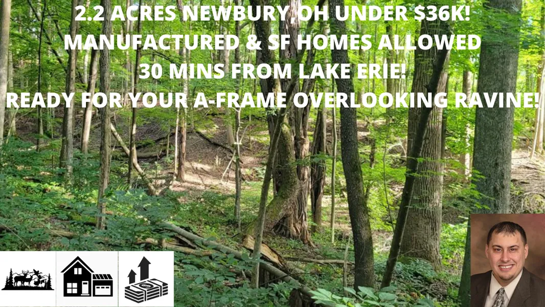 OVER TWO ACRES! 30 MINUTES TO DOWNTOWN CLEVELAND, OHIO. This oversized residential lot is tucked away in the rolling wood hills of Newbury Township surrounded by nature and park; WHAT A PEACEFUL SETTING! Several activities nearby including hiking, fishing and riverfront relaxation! Buyer will need to connect with township zoning on building regulations and guidelines. NO LIENS, NO JUDGMENTS, FREE AND CLEAR TITLE!!!!